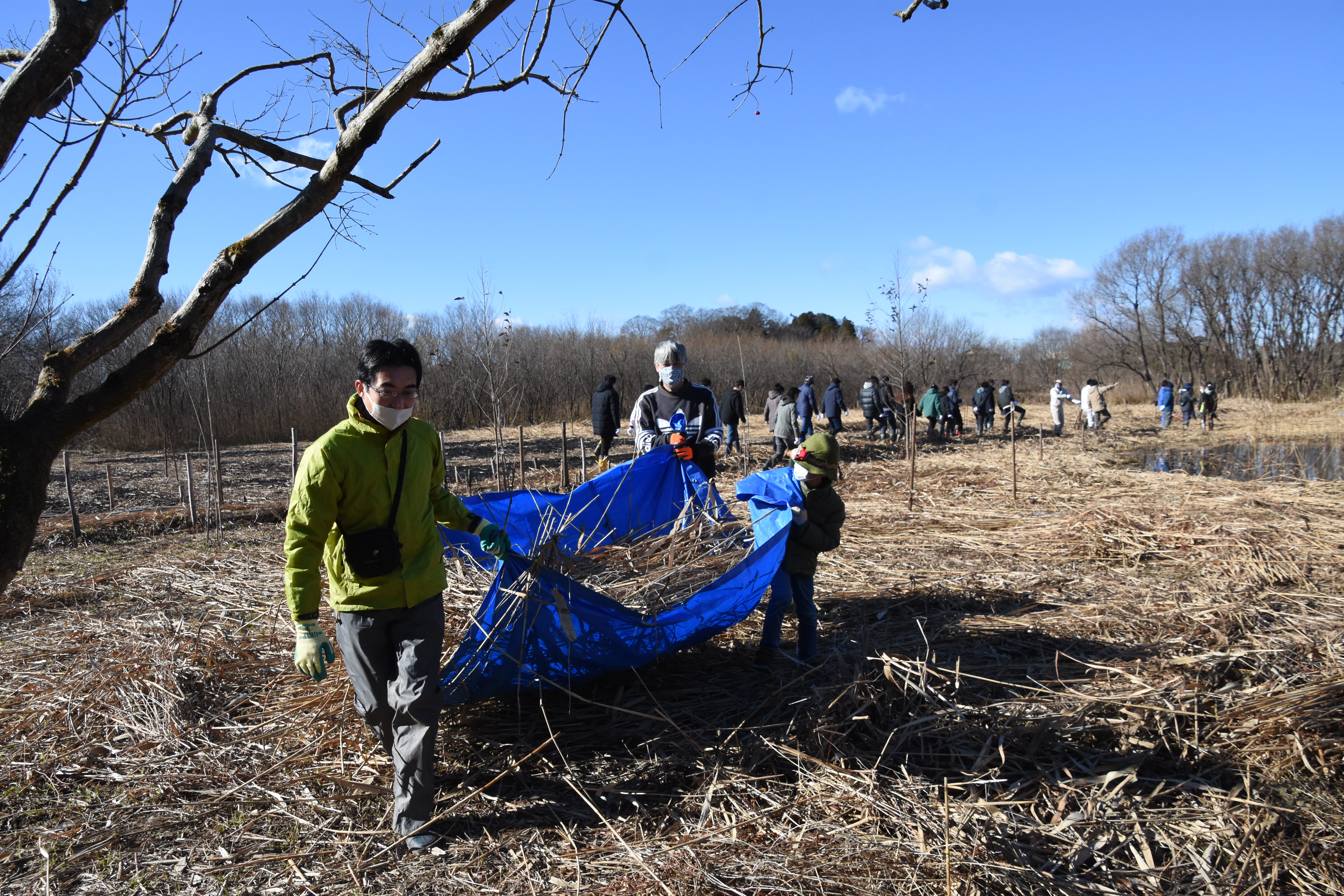 年に一度の「草運び大会」です!みんなで力を合わせて刈ったヨシを運び出すと、地面が冬の太陽をいっぱい浴びて、サクラソウやノウルシなどの早春の植物たちが元気に花を咲かせます。温かい汁物が出ますよ♪