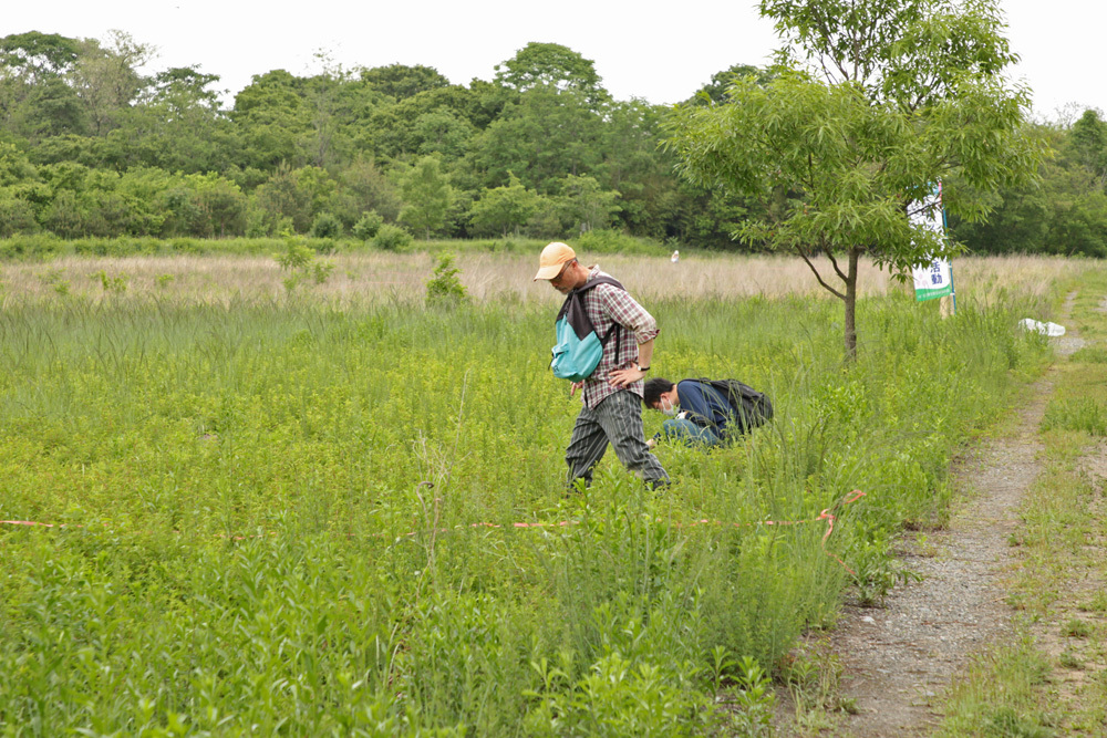公園の野草広場には、カワラナデシコ・カワラサイコなど、河原の草はら特有の希少な植物が多く自生しています。草地の状態を維持するために火入れを行った広場で、カワラナデシコの株数を数えます。