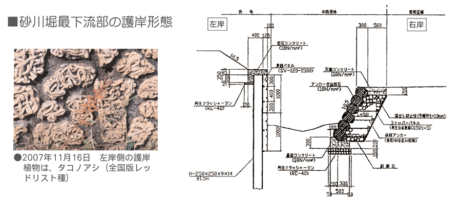 B地区湿地の水源である砂川堀では、河床低下が進行し湿地の乾燥化の原因ともなっているため、川の中への土嚢積みや砕石を詰めた籠マット等を用いた対策を講じています。 |